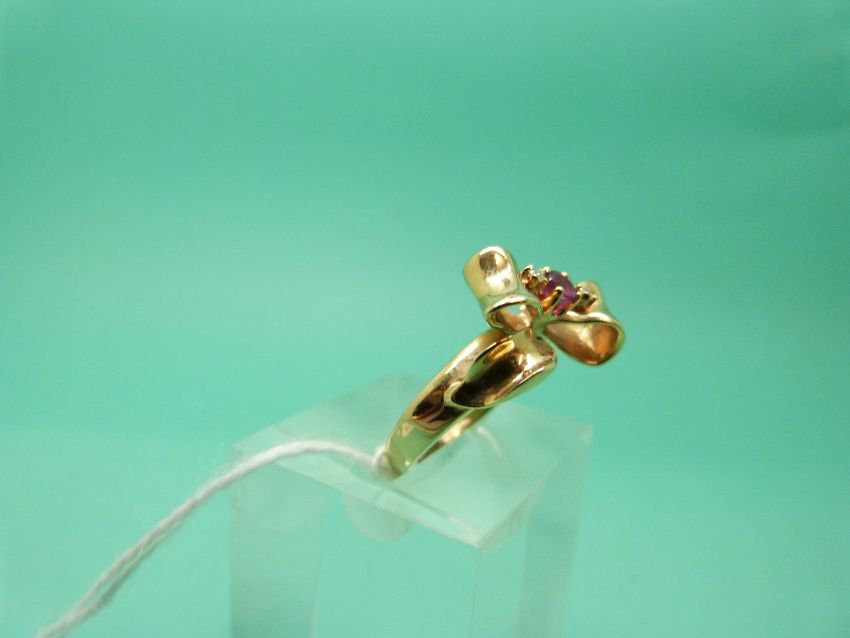A 14ct gold ring set with a ruby and diamonds in a bow shape (Size L)