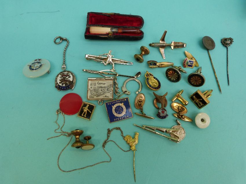 A hallmarked silver lidded pot, cheroot holder with silver collar, inlaid snuff box, silver pencil holder, silver watch, stick pins etc