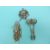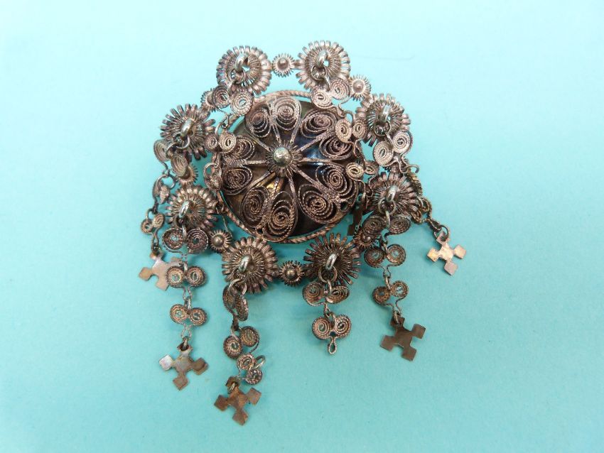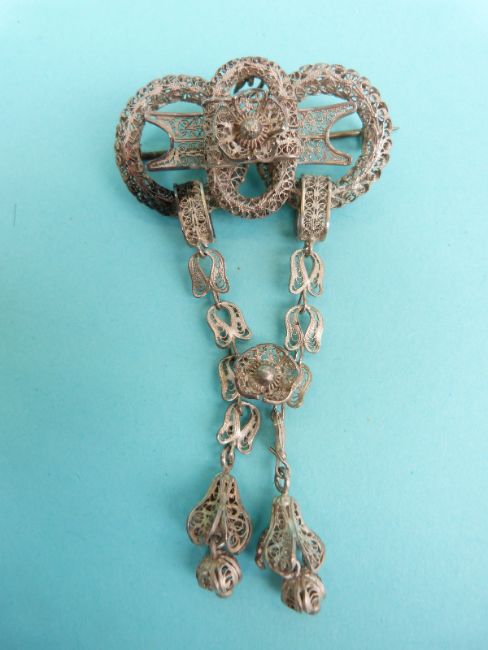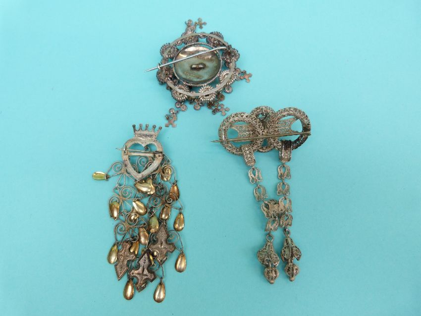 A white metal filigree brooch in a flower design, a white metal brooch in a stylized knot design with two drop sections and a white metal brooch in the form of a heart & crown with three drop sections