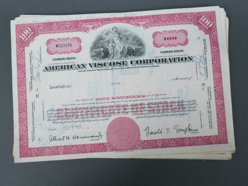 Approximately 100 American Viscose Corporation USA 100 share certificates, includes some consecutive numbers c1960 (pink/puce colour) mostly crisp