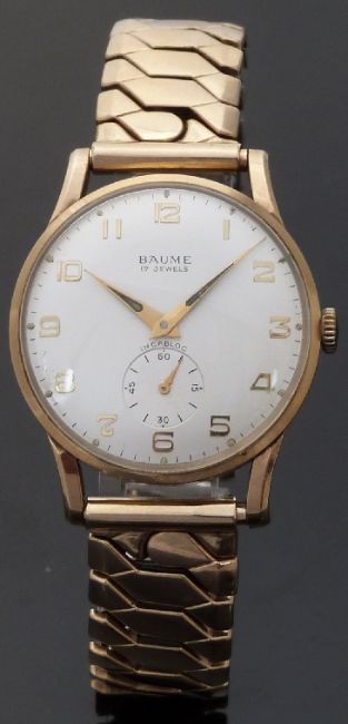 Baume 9ct gold gentleman's wristwatch with inset subsidiary seconds dial, gold Arabic numerals and two tone hands, on expanding metal bracelet, case diameter 33mm.