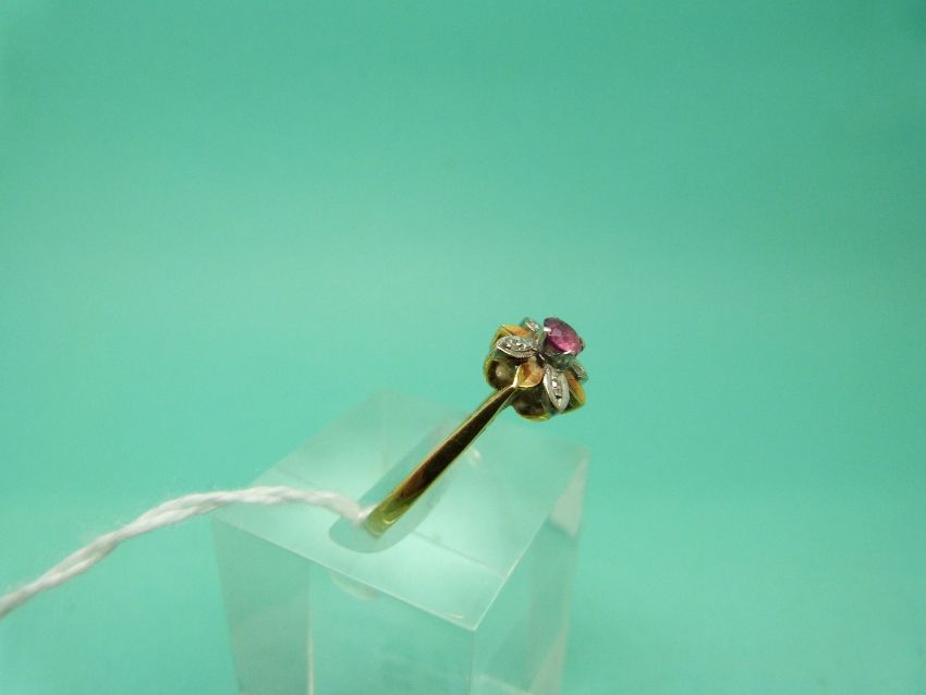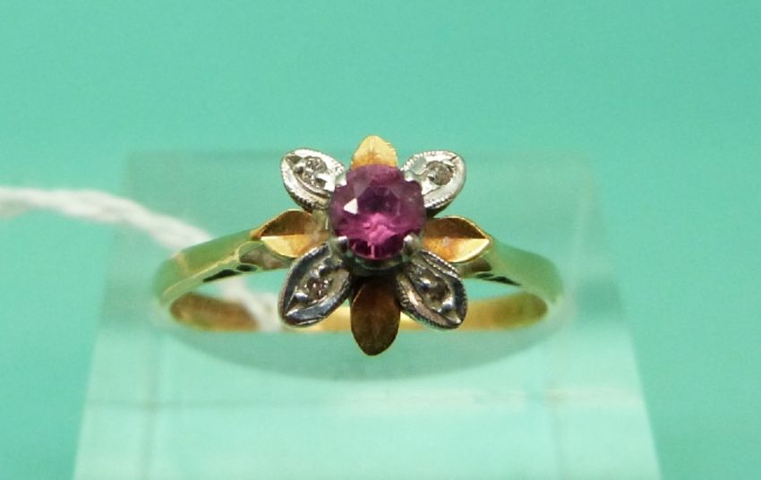 An 18ct gold ring set with a ruby and diamonds in a flower setting (Size O)