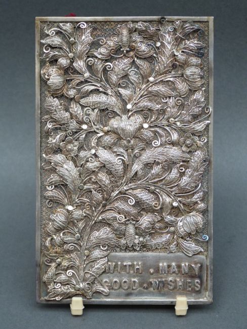 A white metal filigree plaque decorated with raised foliate and butterfly design with Chinese marks to the back, weight 47g, height 12cm