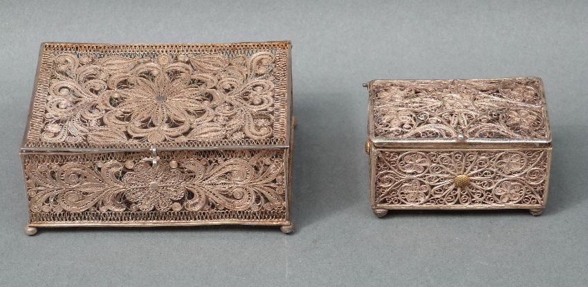 A white metal filigree box 8.5 x 6 x 2.5cm and another smaller example 5.5 x 3.5 x 2cm, weight of both 85g