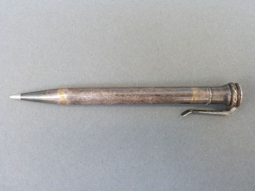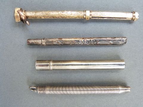 Eight propelling pencils, pencil holders and pens including hallmarked silver, white metal marked sterling, yellow metal hexagonal example etc