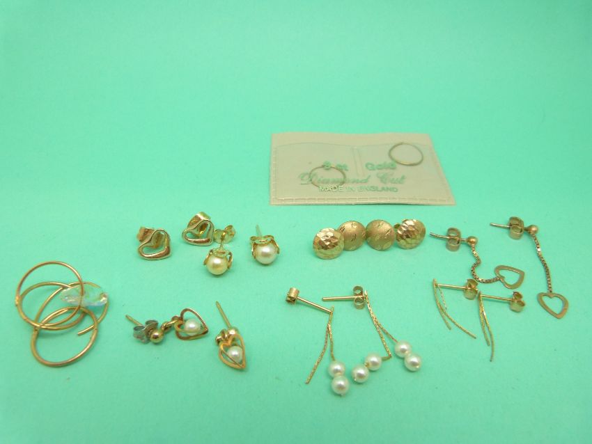 Seven pairs of 9ct gold earrings to include faux pearls etc