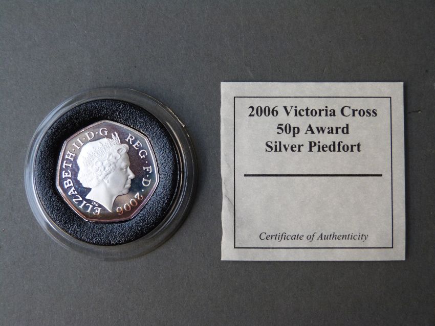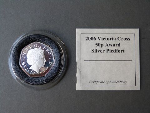 Three cased and certificated silver Piedfort 50 pence coins to include EU and Victoria Cross