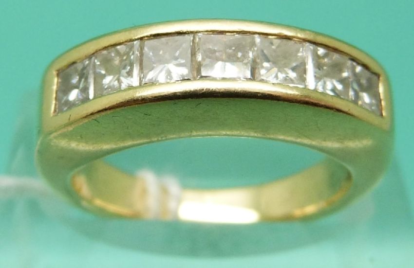 An 18ct gold ring set with seven princess cut diamonds (Size K)