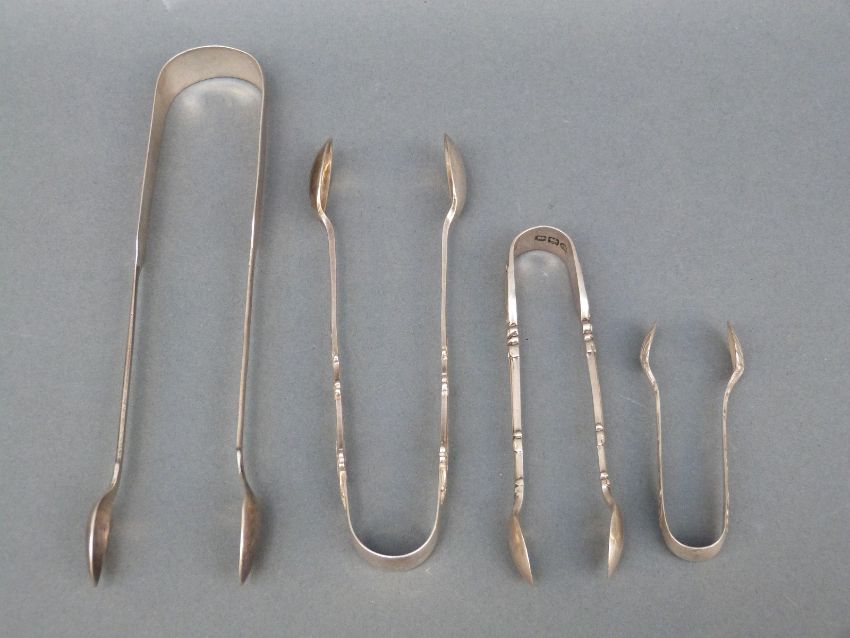 Four sets of hallmarked silver sugar tongs, one Exeter 1825, length 16cm, weight of all four 97g