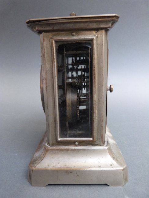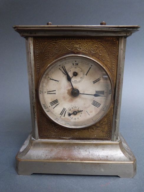 Late 19th century musical German made mantel/shelf clock in brass and plated case with chased decoration to front, the Swiss musical movement playing 'God Bless the Prince of Wales, the red, white and blue' on the alarm, the paper Roman dial with secondary seconds and steel blue hands, 15cm tall