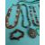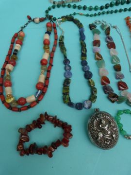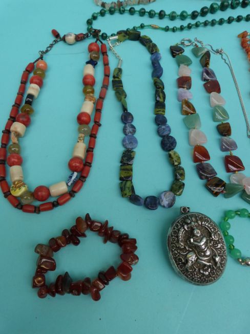 A large white metal locket with embossed Middle Eastern design, agate, malachite and Oriental necklaces etc