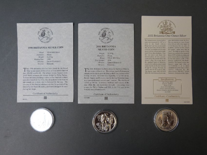 Three silver Britannia coins comprising 1998, 2001 and 2002 with certificates