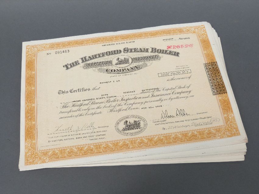 Approximately 100 The Hartford Steam Boiler Company Connecticut USA 1970s and early 1980's five dollar share certificates, some consecutive (all in mustard yellow colour) various share values up to 1258 on one, crisp