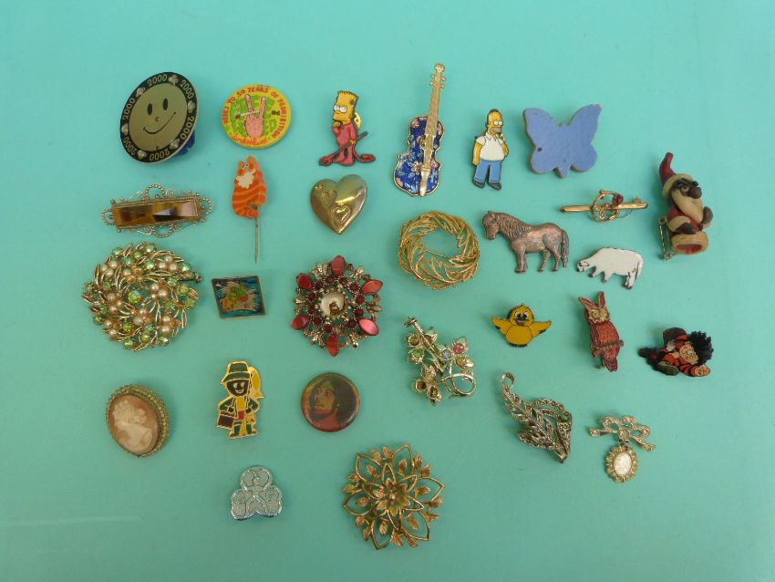 A collection of brooches to include a 9ct gold Edwardian brooch, silver brooch in the form of a horse, an enamel brooch, tigers eye brooch etc