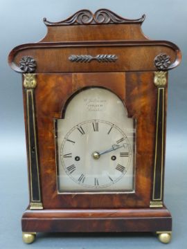 W.Johnson, The Strand, London 19th century flame mahogany shelf/mantel clock, the twin fusee movement striking on two bells with silvered Roman dial and pierced heart shaped hands, raised on circular bun feet