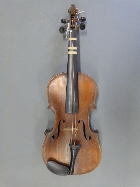 A late 19th/20thC unlabelled violin with 35cm back, complete with two bows