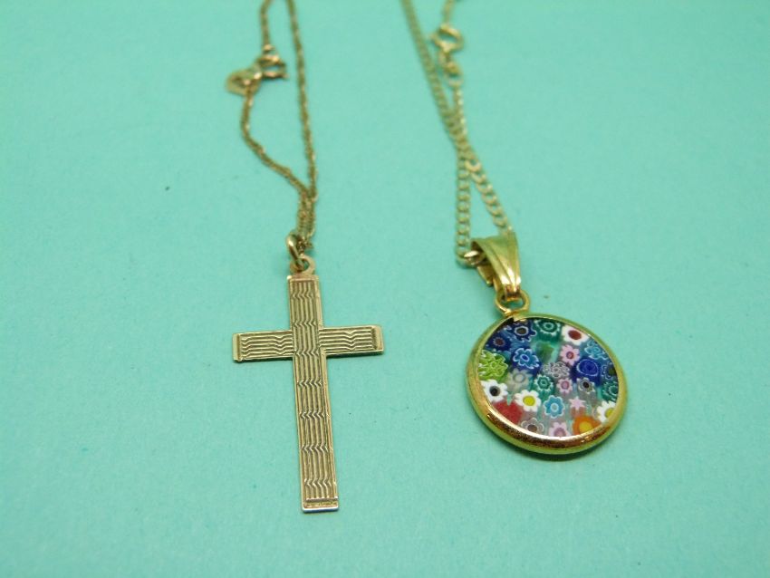Two 9ct gold chains, a millefiori pendant and a 9ct gold cross pendant, weight 4.2g