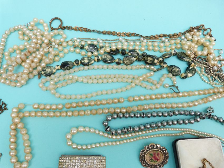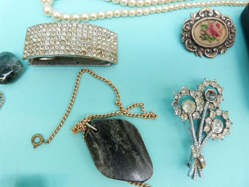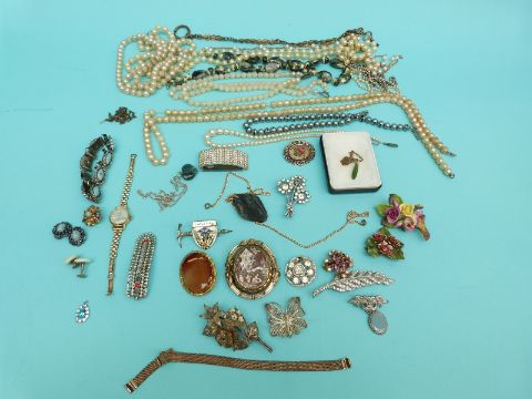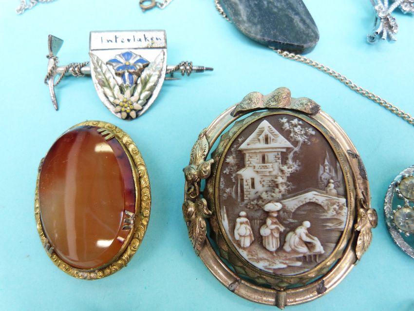 A collection of jewellery to include a Victorian cameo brooch, jadeite pendant, Victorian agate brooch, faux pearls, paste brooch, filigree brooch etc