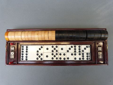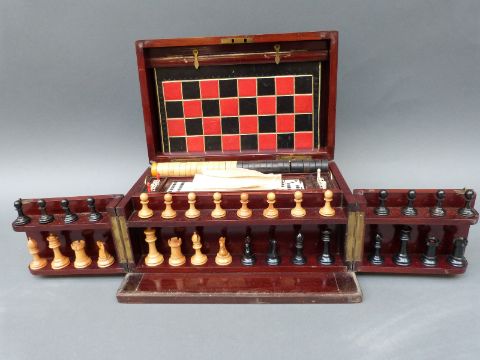 A late 19th/early 20thC games compendium, comprising chess, draughts, dice, backgammon, horse racing etc. in mahogany case, width 33cm