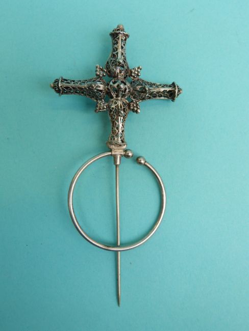 A white metal filigree necklace made up of three layered flowers, a filigree necklace made up of foliate sections and a filigree scarf holder in the form of a cross