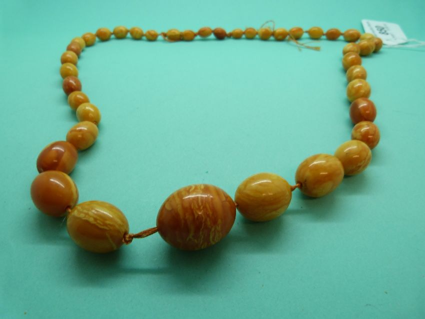 An amber necklace made up of oval graduated egg yolk coloured beads, 61g.