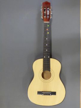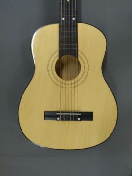 Child size acoustic guitar fitted with 6 nylon strings, with guitar tutor book and instruction CD