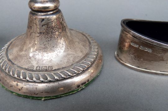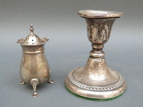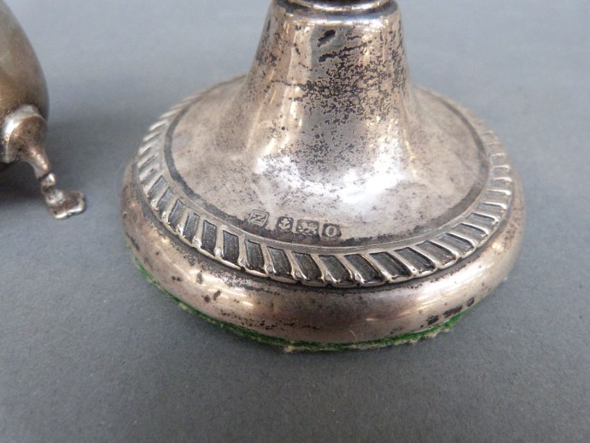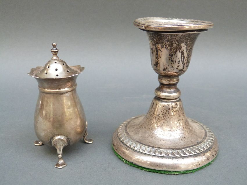 A hallmarked silver open salt, silver pepper and a candlestick