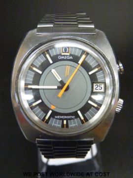 Omega Memomatic gentleman's automatic wristwatch with date aperture, alarm function, luminous white and orange baton markers and orange seconds hand, in stainless steel case, on stainless steel bracelet, case size 40x45mm.