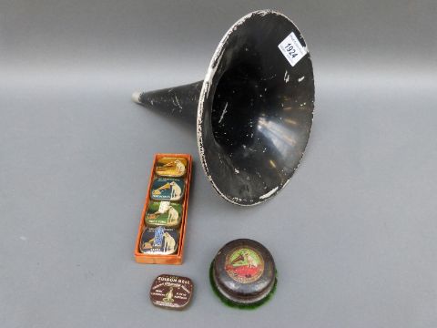 A box containing four HMV tins of gramophone needles - soft to extra loud, together with an Edison Bell tin, an early record brush, a vintage metal horn and a Russian Signal 601 pocket clock radio