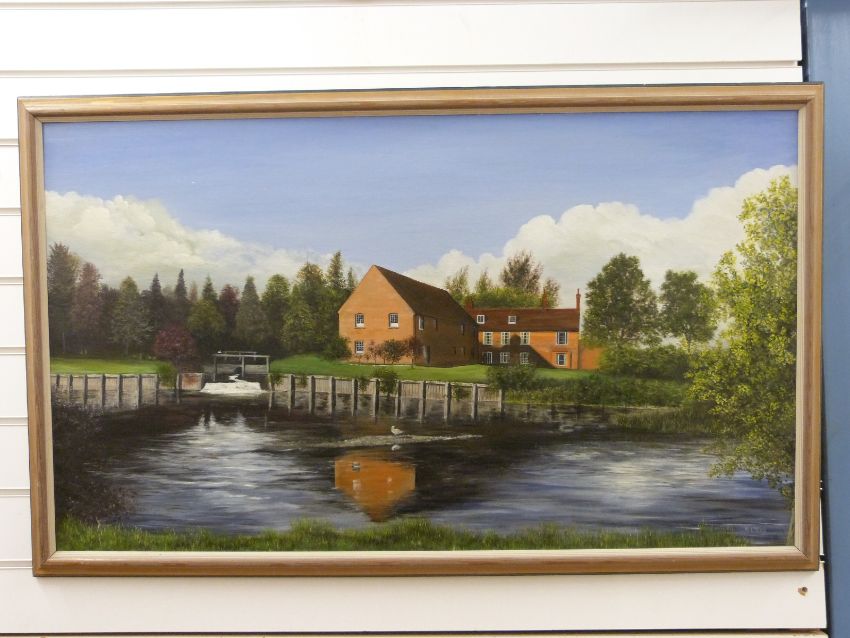 M L Tribe acrylic on board waterside scene with houses by weir, 60 x 102cm