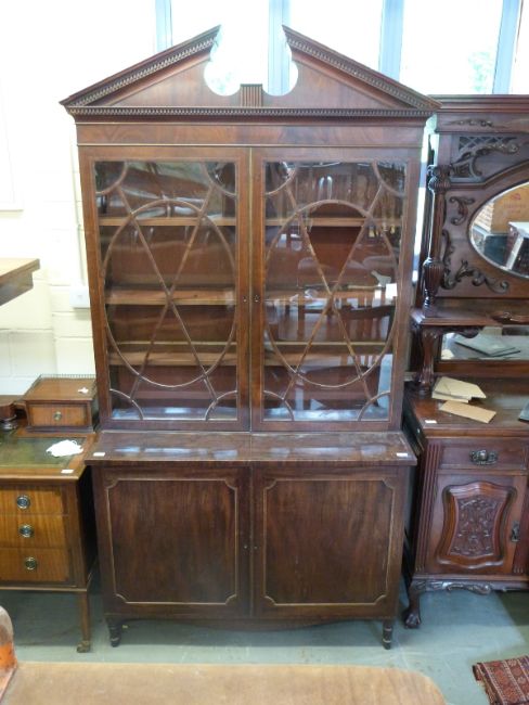 A 19thC mahogany bookcase, the top with astragal glazed doors opening to reveal adjustable shelves with broken pediment having dentil decoration, the base having two panelled doors opening to reveal slide out trays, raised on reeded legs, W121 x D56 x H235cm