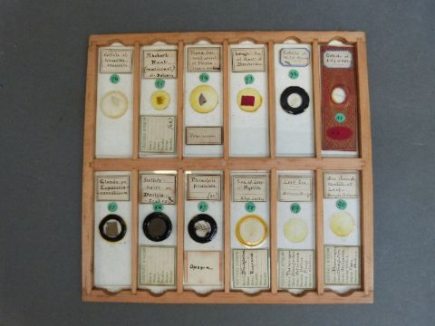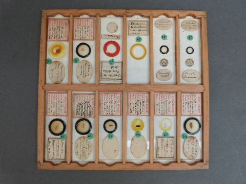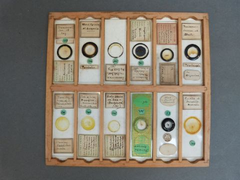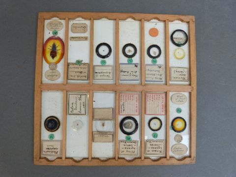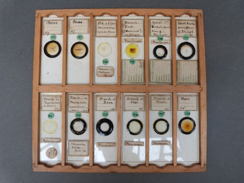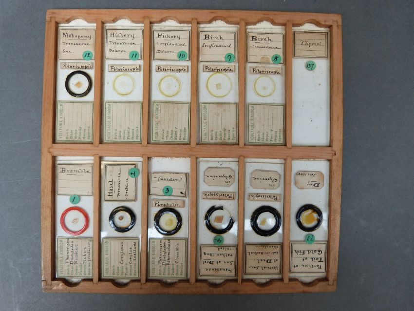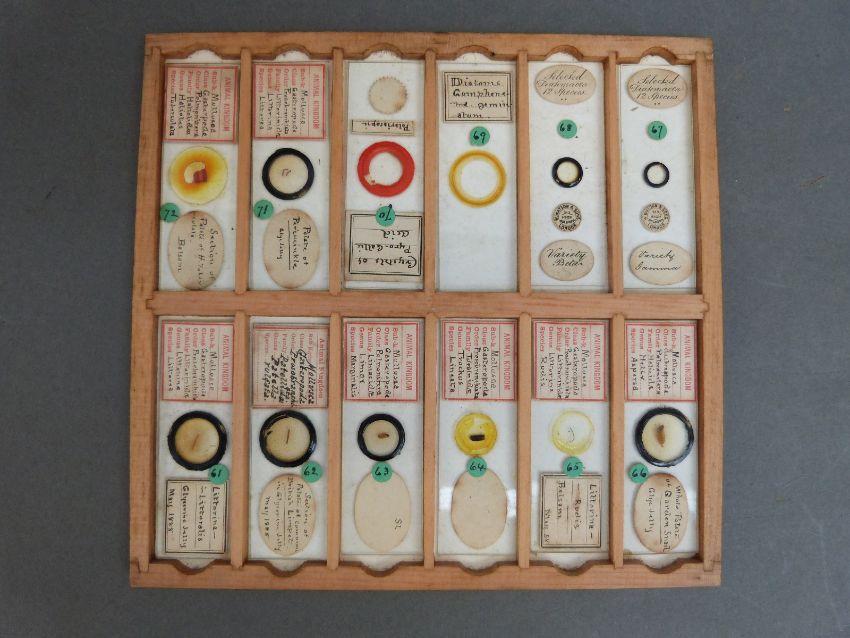 A cased set of microscope slides comprising twelve trays of largely botanical, insects and fish sample sections, together with a late 19thC Practical Microscopy book by George E Davis, some further slides and a cased set of travelling scales