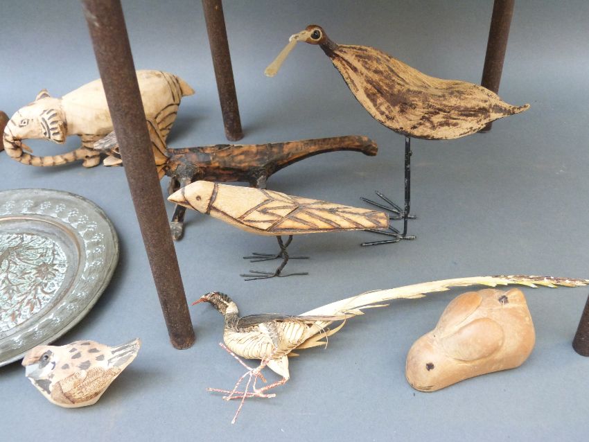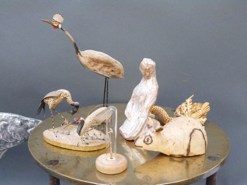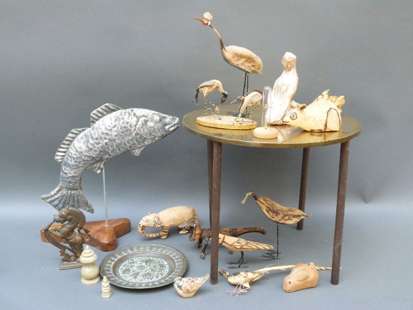 A brass trivet marked 20. W O 14851, pewter or similar fish, Eastern dish, Eastern bronze dragon, birds etc