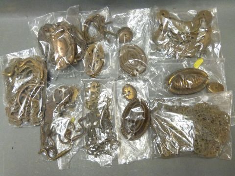 Georgian, Victorian and later brass door furniture suitable for furniture restoration/cabinet making, includes multiple Georgian decorative sets mostly with pierced decoration