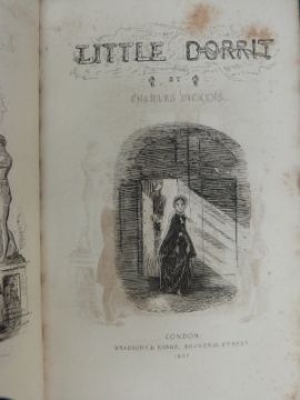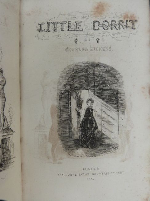 Charles Dickens Little Dorrit, illustrated by H.K. Browne. London Bradbury & Evans 1857. First edition with engraved title. Contemporary half black leather with raised bands & gilt decorated spine