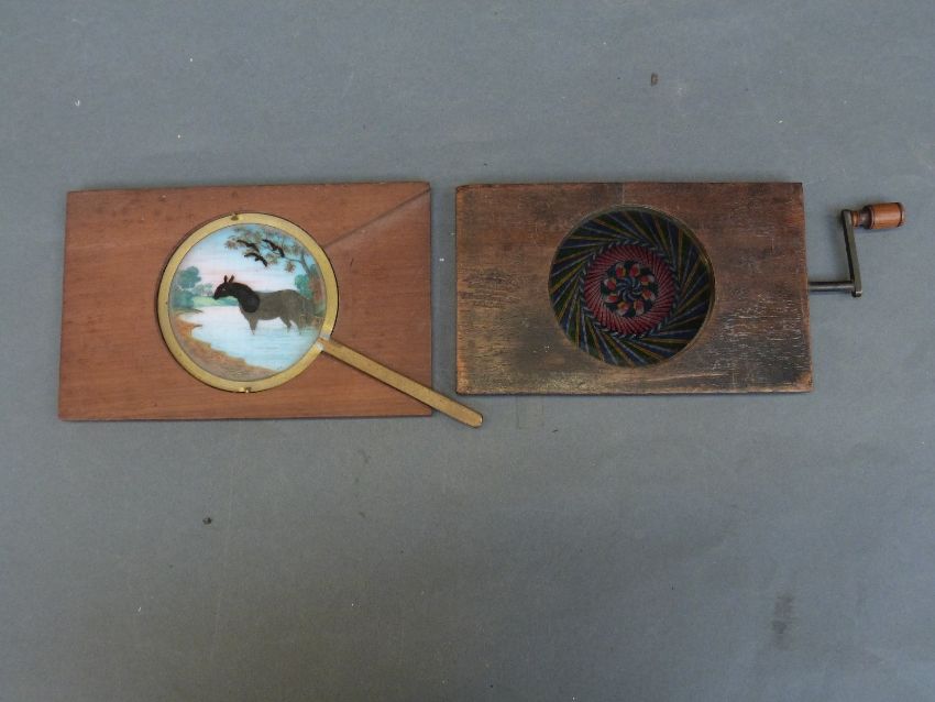 Two late 19th/20th century magic lantern slides to include a hand turned kaleidoscope example and a horse drinking from a stream with birds above