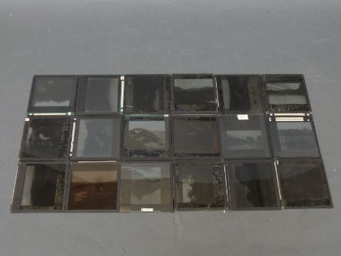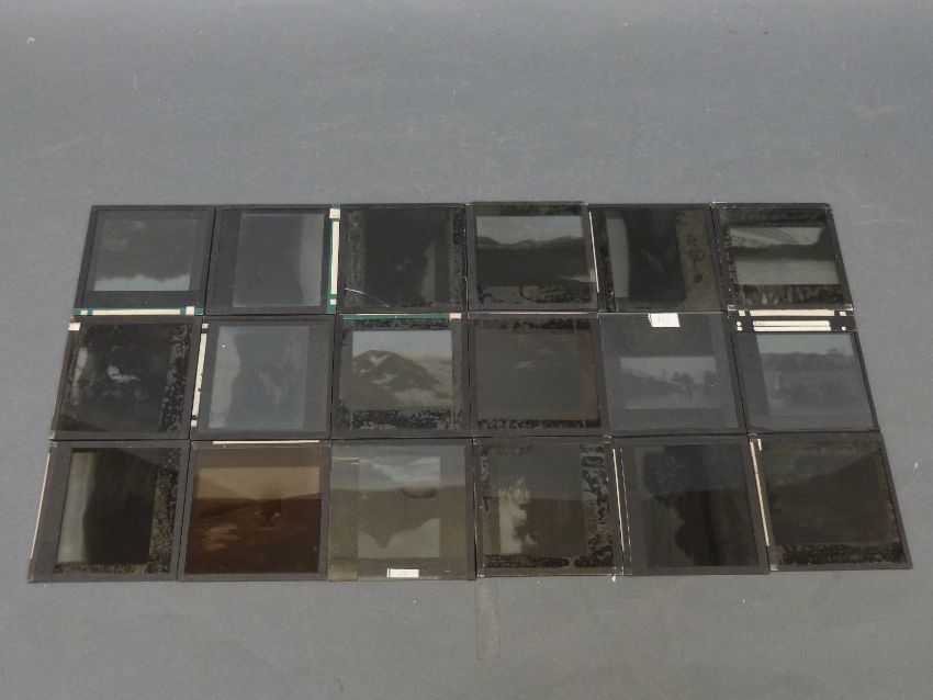 A quantity of magic lantern slides of landscape scenes, most unscripted to include fishing, cattle grazing etc together with a slide possibly showing an Indian village and a scene of Switzerland