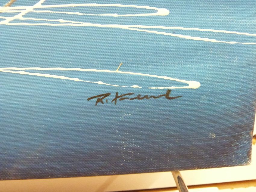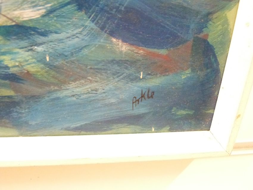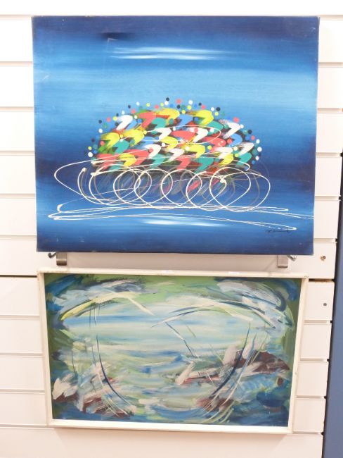 Modern acrylic on canvas cyclists, indistinctly signed possible R. Kene, 52 x 62cm and another abstract work signed William Arkle, 40 x 60cm