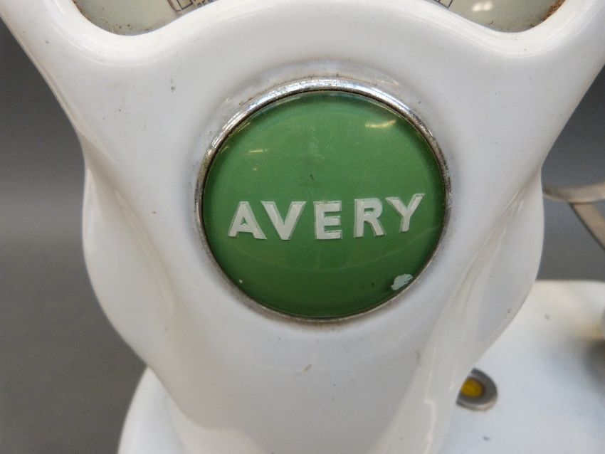 A set of Avery grocer's scales in white enamel finish with prices to the scales dial in pre-decimal 1d and 1/2d divisions