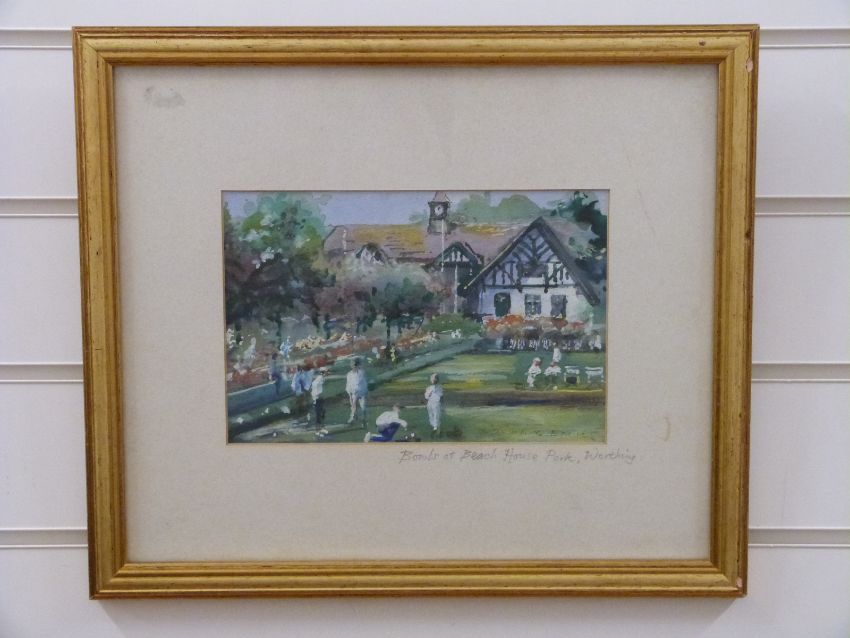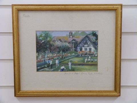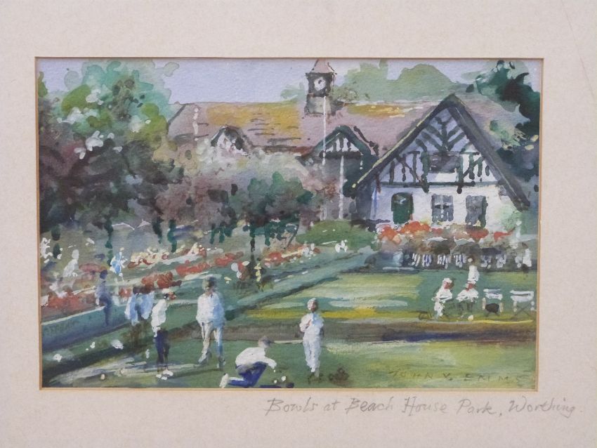 John V Emm watercolour "Bowls at Beach House Park, Worthing, 15cm x 22cm
