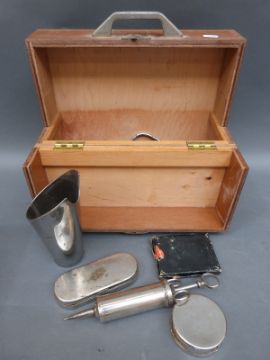 A cased GP or similar travelling medical kit including ear syringing kit, forceps etc., some named Dr I Braithwaite and a sphygmomanometer