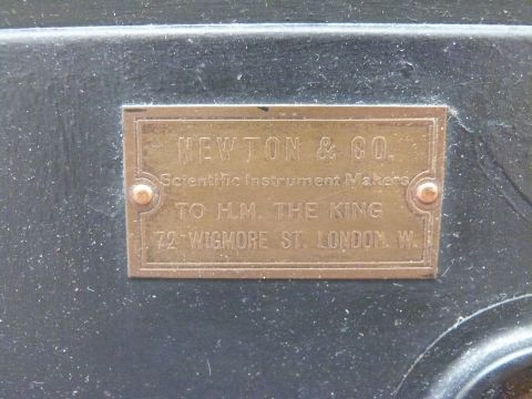 A late 19th century magic lantern with maker's plaque for Newton & Co scientific instrument makers, 72 Wigmore Street, London with later replacement electric lighting, spare bulb, lens and wooden slide etc