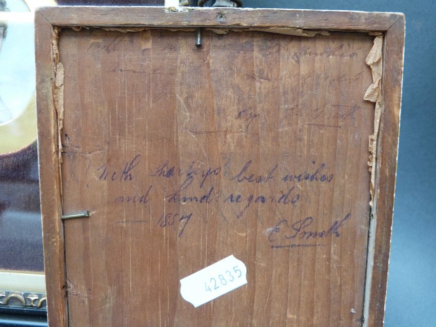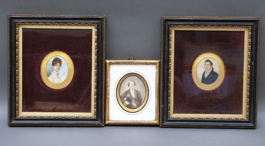 A pair of 19thC portrait miniature on ivory of a lady and gentleman, maximum diameter 6cm and a pencil miniature dated 1857 verso