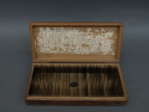 A fitted wooden case containing 26 early 20thC slides of mountaineering scenes, some titled including 'The Canon's party coming near the top' and 'Weisshorn 1st ascent'