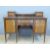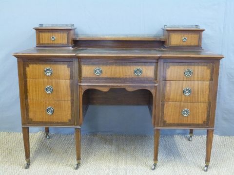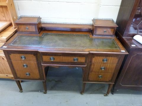 A late 19th/early 20thC leather inset desk with two drawers to top and galleried back, the base fitted one central drawer flanked by three graduated drawers, raised on square tapering legs terminating in brass castors, W137 x D60 x H99cm
