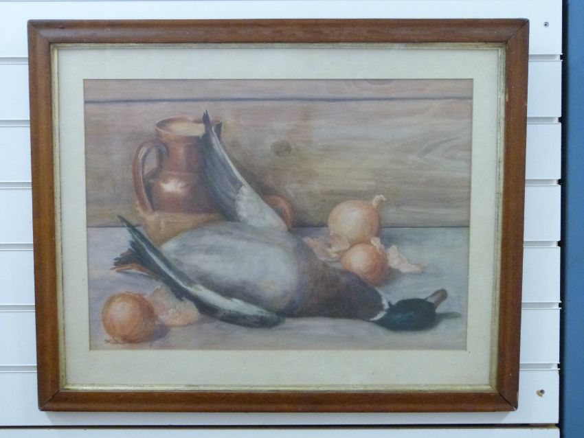 Elizabeth Holden watercolour 'Still Life of a Stoneware Jug, Mallard and Onions', signed lower left, 42 x 60cm