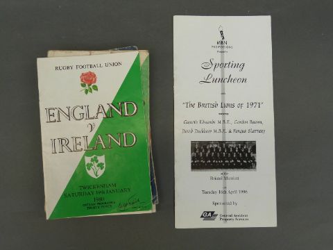 A British and Irish Lions 1971 Sporting Luncheon menu signed by players including Gareth Edwards, Fergus Slattery & David Duckham and a collection of England and other rugby programmes