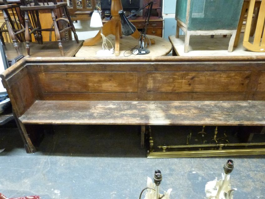 An oak church pew, length 308cm