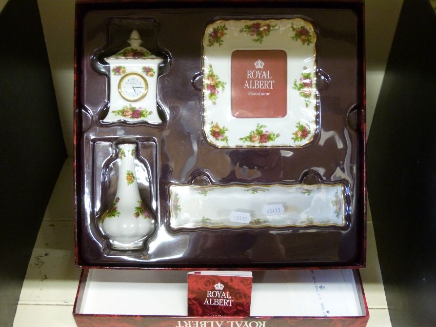 Royal Albert boxed Old Country Roses set comprising clock, picture frame, stem vase and mint tray