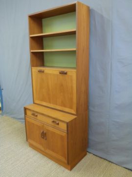 A retro G plan bookcase with fall flap bureau door opening to reveal a fitted interior above a single drawer and twin door cupboard with shelf (H200 x W84 x D46cm)